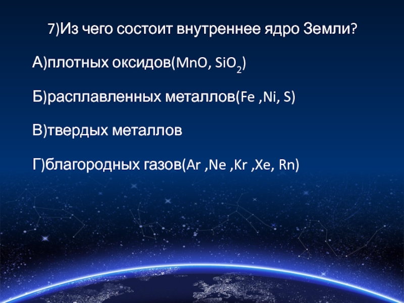 Слайд 97)Из чего состоит внутреннее ядро Земли?