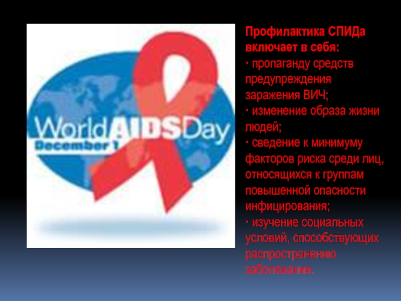 со СПИДом (World AIDS Day) впервые отмечался 1 декабря 1988 года. Ежегодно отмечаемый 1 декабря Всемирный день борьбы со СПИДом служит делу укрепления организованных усилий по борьбе с пандемией ВИЧ-инфекции и СПИДа.