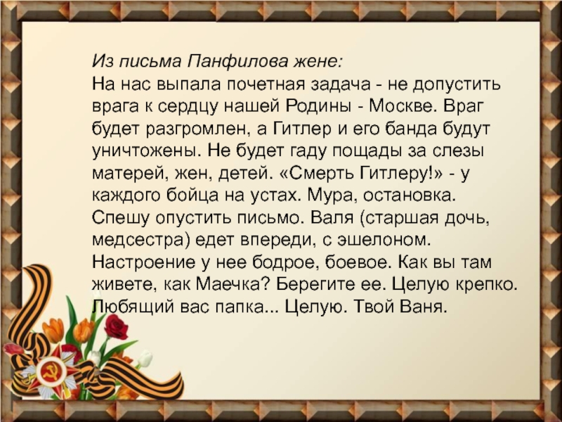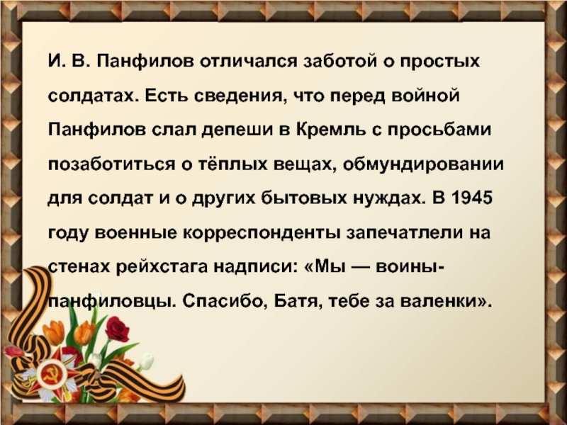 Слайд 15И. В. Панфилов отличался заботой о простых солдатах. Есть сведения,