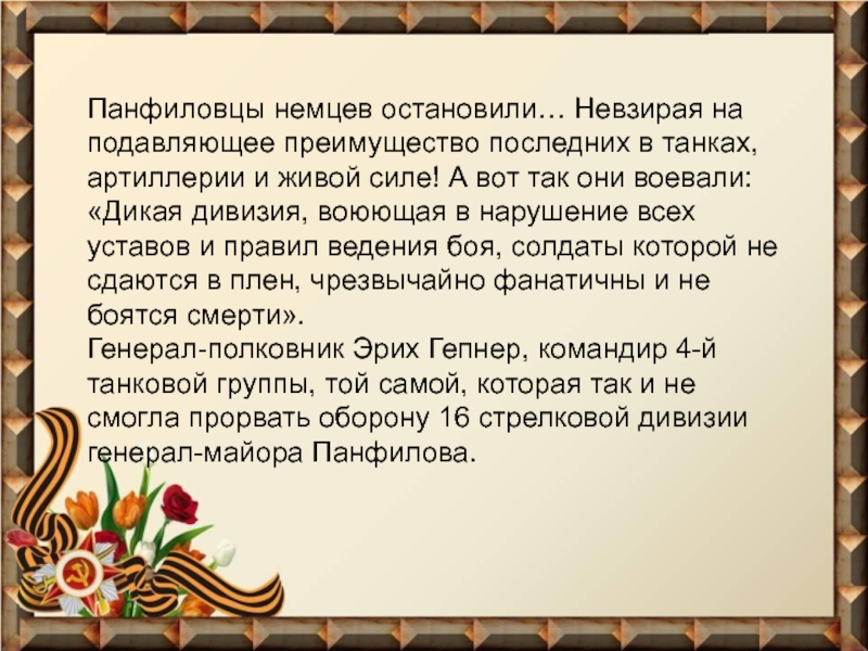 Слайд 9Панфиловцы немцев остановили… Невзирая на подавляющее преимущество последних в танках,