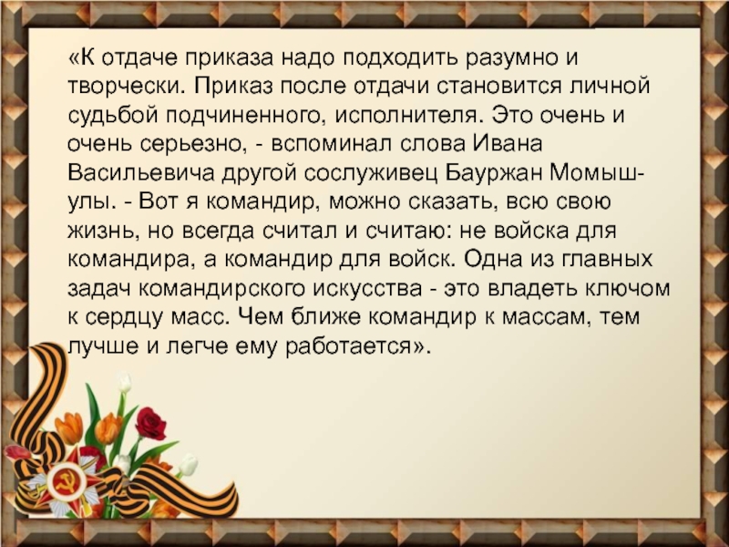 серьезно, - вспоминал слова Ивана Васильевича другой сослуживец Бауржан Момыш-улы. - Вот я командир, можно сказать, всю свою жизнь, но всегда считал и считаю: не войска для командира, а командир для войск. Одна из главных задач командирского искусства - это владеть ключом к сердцу масс. Чем ближе командир к массам, тем лучше и легче ему работается».