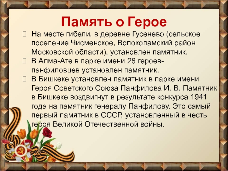 Именем Панфилова названы улицы в 40 городах, селах и деревнях бывшего Советского Союза