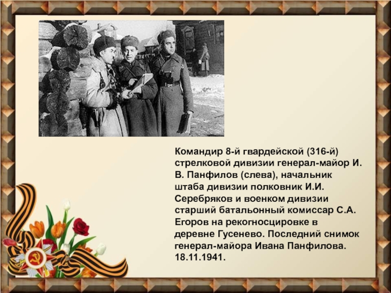 Слайд 10Командир 8-й гвардейской (316-й) стрелковой дивизии генерал-майор И. В. Панфилов