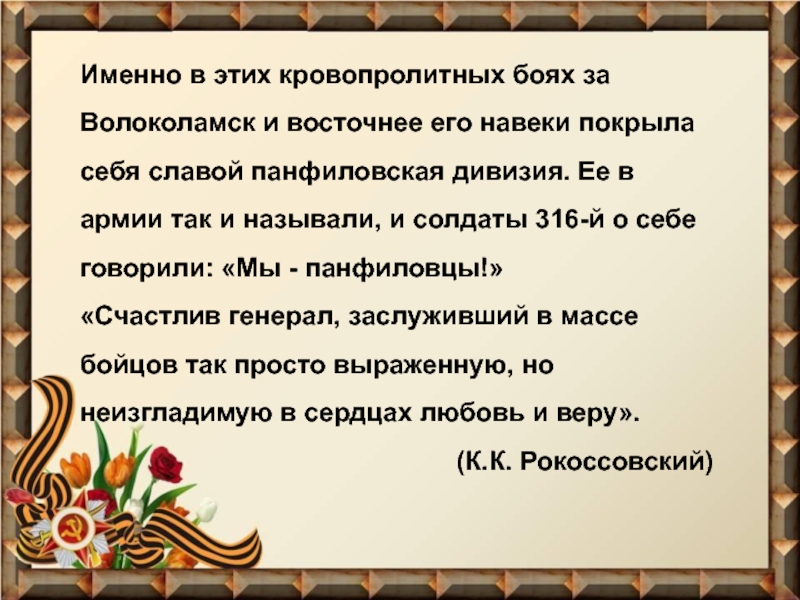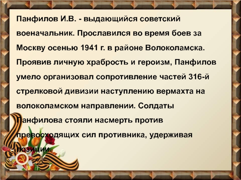 Слайд 6Панфилов И.В. - выдающийся советский военачальник. Прославился во время боев