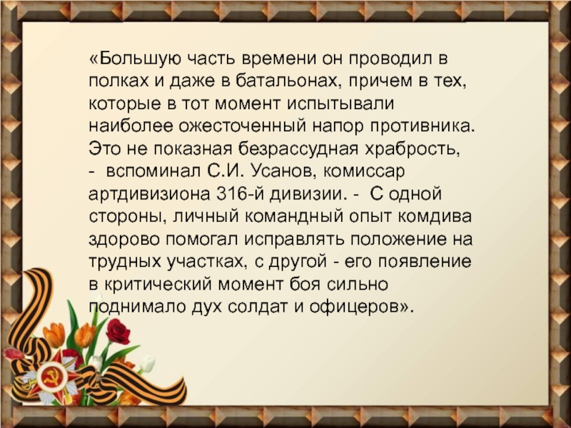 ожесточенный напор противника. Это не показная безрассудная храбрость, - вспоминал С.И. Усанов, комиссар артдивизиона 316-й дивизии. - С одной стороны, личный командный опыт комдива здорово помогал исправлять положение на трудных участках, с другой - его появление в критический момент боя сильно поднимало дух солдат и офицеров».