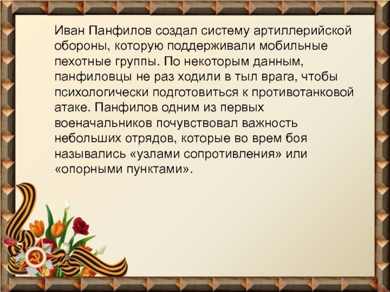 Слайд 11Иван Панфилов создал систему артиллерийской обороны, которую поддерживали мобильные пехотные