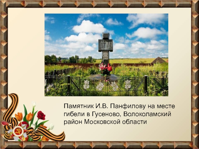 Слайд 25Памятник И.В. Панфилову на месте гибели в Гусеново, Волоколамский район