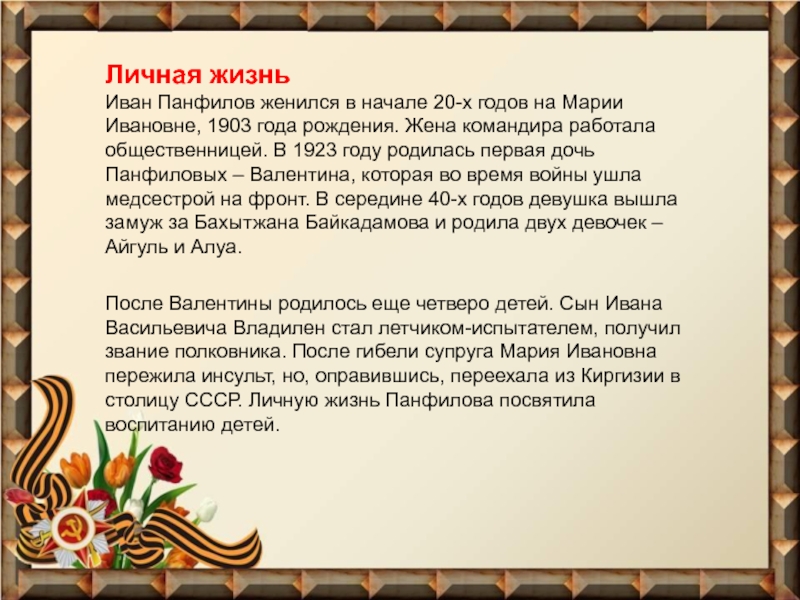 году родилась первая дочь Панфиловых – Валентина, которая во время войны ушла медсестрой на фронт. В середине 40-х годов девушка вышла замуж за Бахытжана Байкадамова и родила двух девочек – Айгуль и Алуа.
