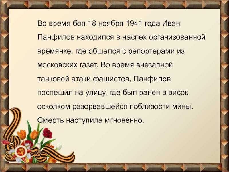 Слайд 18Во время боя 18 ноября 1941 года Иван Панфилов находился