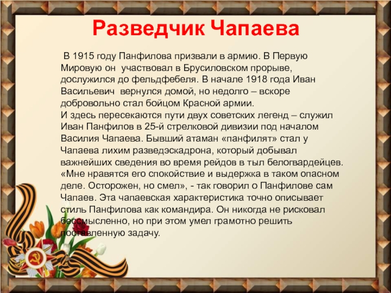 И здесь пересекаются пути двух советских легенд – служил Иван Панфилов в 25-й стрелковой дивизии под началом Василия Чапаева. Бывший атаман «панфилят» стал у Чапаева лихим разведэскадрона, который добывал важнейших сведения во время рейдов в тыл белогвардейцев. «Мне нравятся его спокойствие и выдержка в таком опасном деле. Осторожен, но смел», - так говорил о Панфилове сам Чапаев. Эта чапаевская характеристика точно описывает стиль Панфилова как командира. Он никогда не рисковал бессмысленно, но при этом умел грамотно решить поставленную задачу.