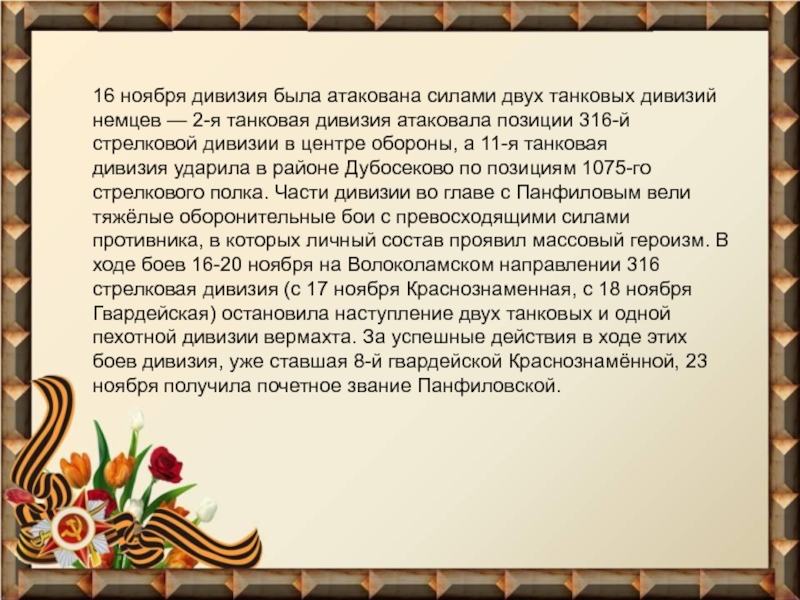 Слайд 1316 ноября дивизия была атакована силами двух танковых дивизий немцев — 2-я