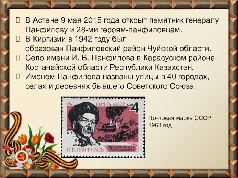 Слайд 21В Астане 9 мая 2015 года открыт памятник генералу Панфилову