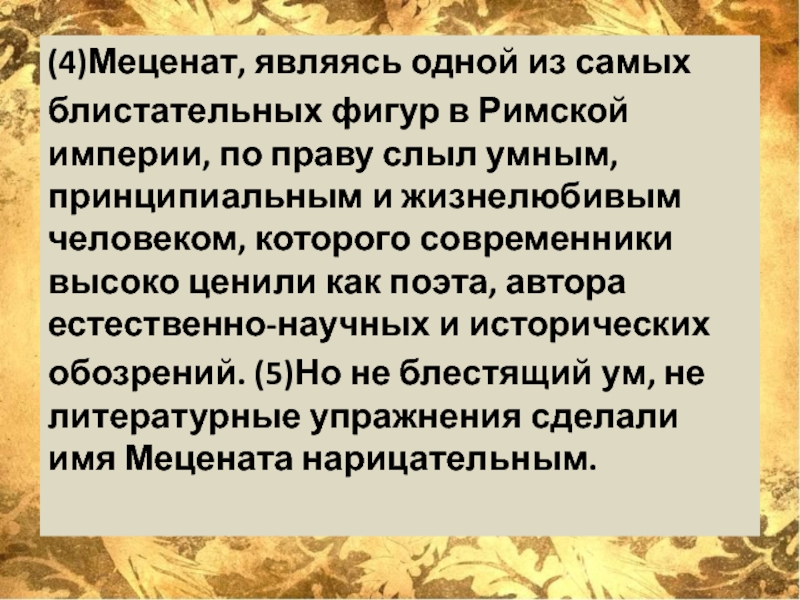 обозрений. (5)Но не блестящий ум, не литературные упражнения сделали имя Мецената нарицательным.