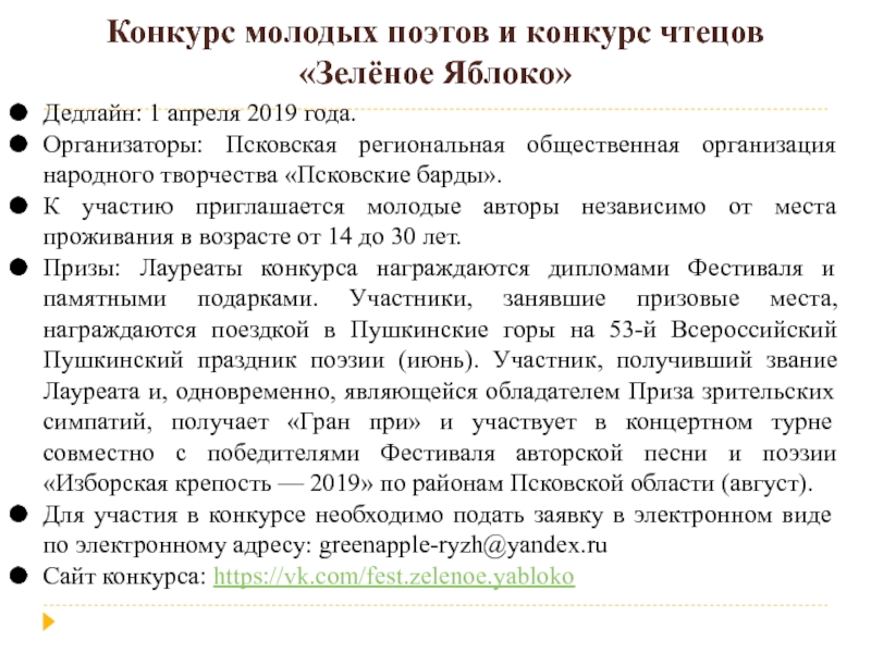 Слайд 31Конкурс молодых поэтов и конкурс чтецов «Зелёное Яблоко»