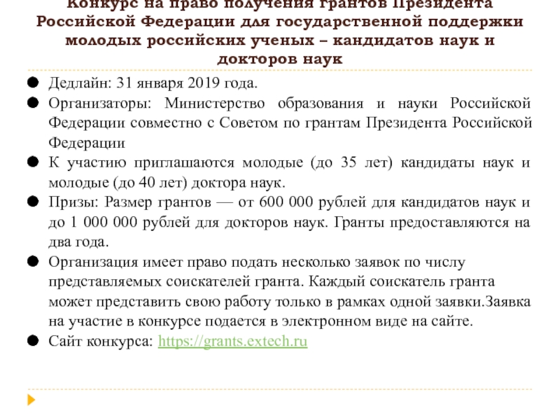 Слайд 4Конкурс на право получения грантов Президента Российской Федерации для государственной