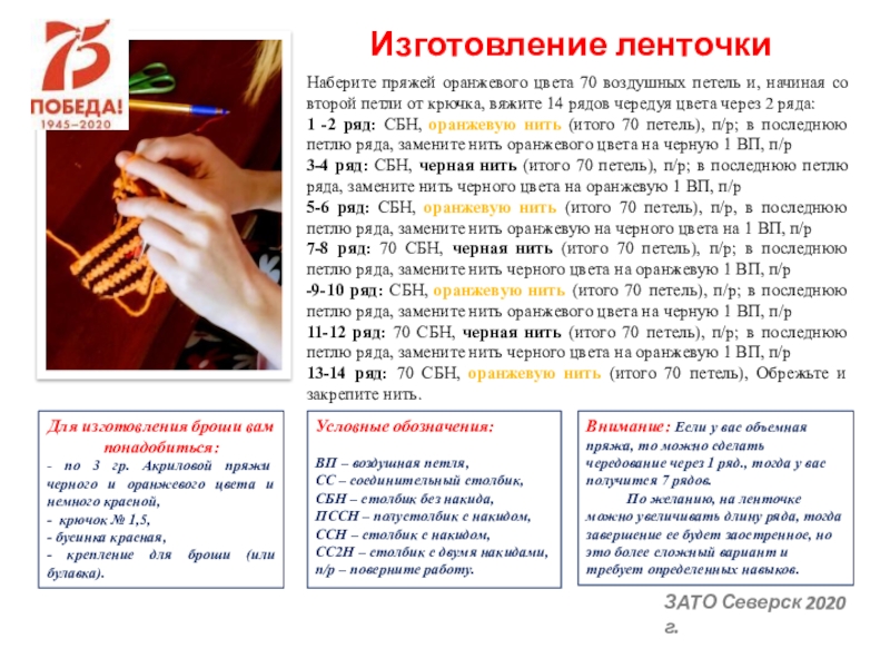 1 -2 ряд: СБН, оранжевую нить (итого 70 петель), п/р; в последнюю петлю ряда, замените нить оранжевого цвета на черную 1 ВП, п/р