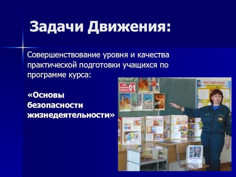Задачи Движения:Совершенствование уровня и качествапрактической подготовки учащихся по программе курса: «Основы безопасности жизнедеятельности»
