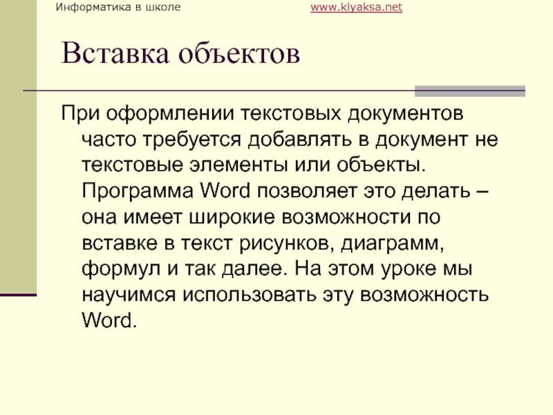 Вставка объектовПри оформлении текстовых документов часто требуется добавлять в документ не текстовые элементы или объекты. Программа Word