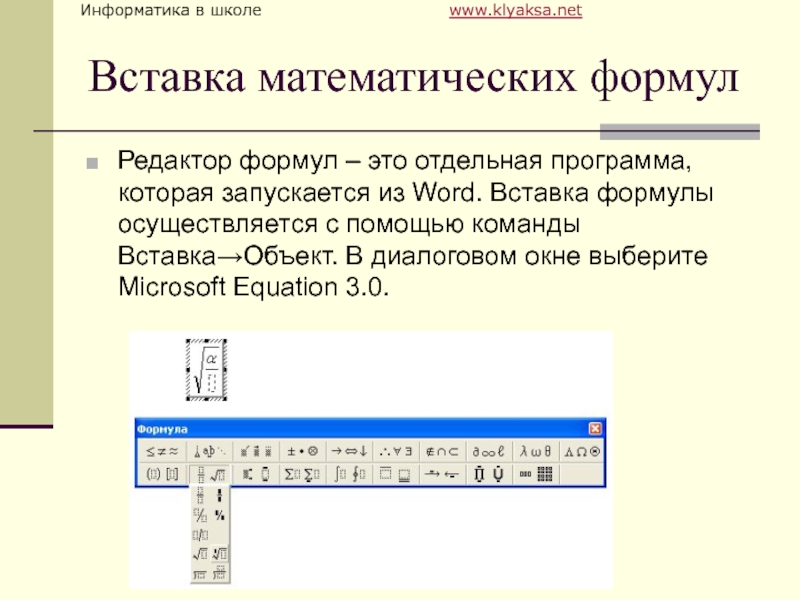 Вставка математических формулРедактор формул – это отдельная программа, которая запускается из Word. Вставка формулы осуществляется с помощью
