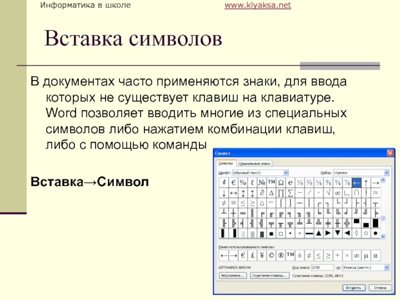 Вставка символовВ документах часто применяются знаки, для ввода которых не существует клавиш на клавиатуре. Word позволяет вводить