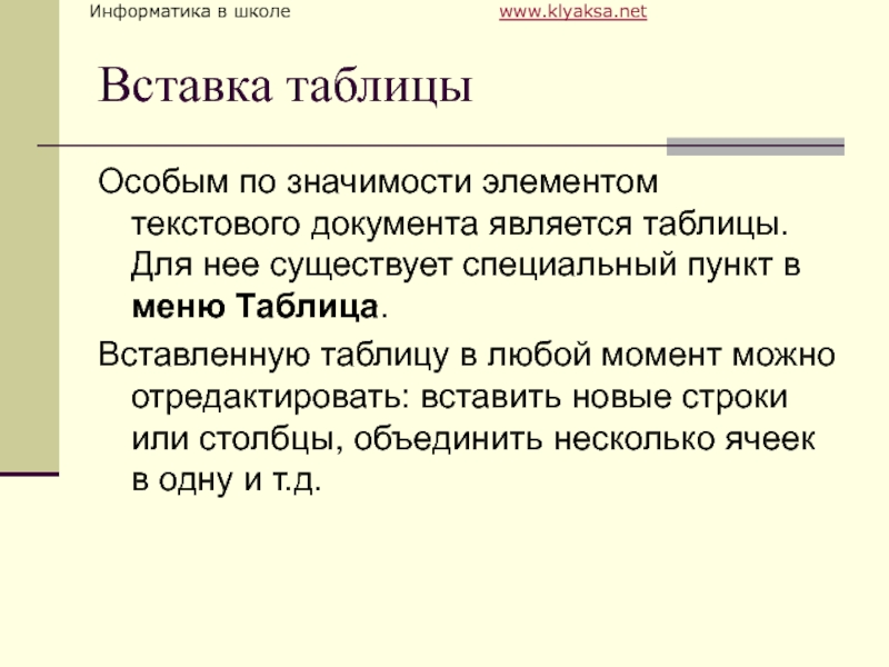 Вставка таблицыОсобым по значимости элементом текстового документа является таблицы. Для нее существует специальный пункт в меню Таблица.Вставленную