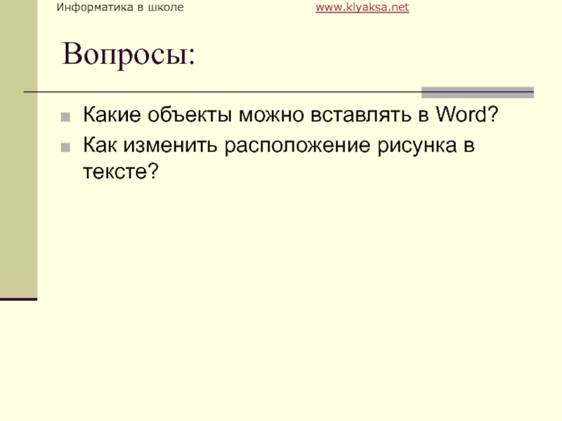 Вопросы:Какие объекты можно вставлять в Word?Как изменить расположение рисунка в тексте?