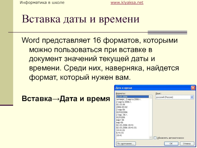 Вставка даты и времениWord представляет 16 форматов, которыми можно пользоваться при вставке в документ значений текущей даты