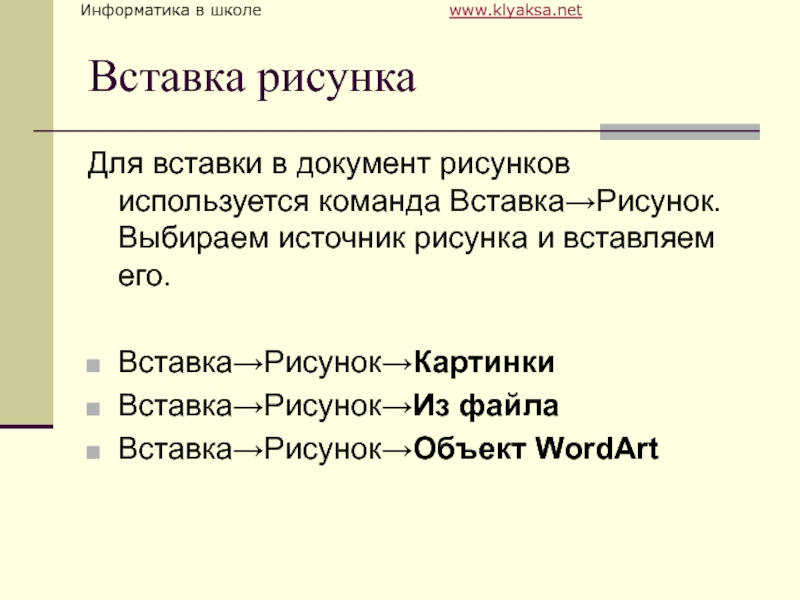 Вставка рисункаДля вставки в документ рисунков используется команда Вставка→Рисунок. Выбираем источник рисунка и вставляем его. Вставка→Рисунок→Картинки Вставка→Рисунок→Из