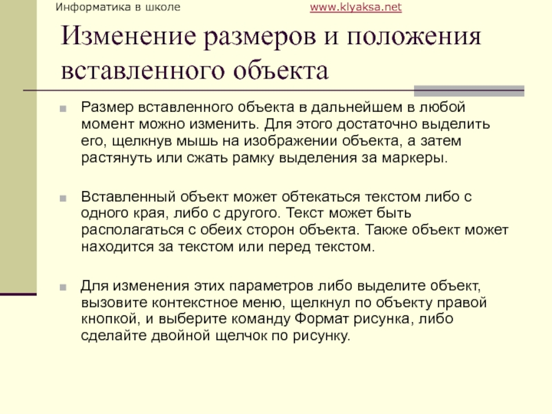 Изменение размеров и положения вставленного объектаРазмер вставленного объекта в дальнейшем в любой момент можно изменить. Для этого