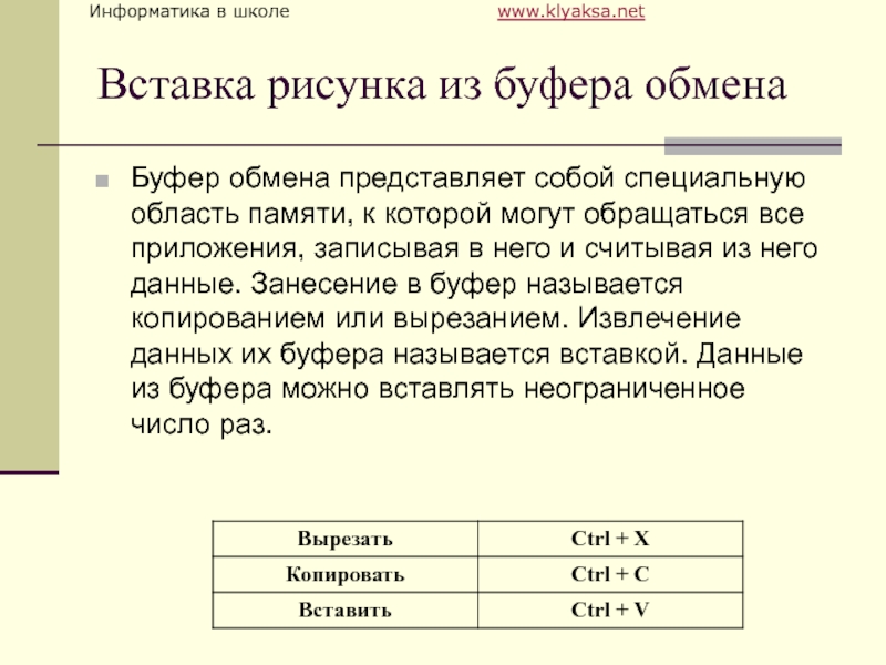 и считывая из него данные. Занесение в буфер называется копированием или вырезанием. Извлечение данных их буфера называется вставкой. Данные из буфера можно вставлять неограниченное число раз.