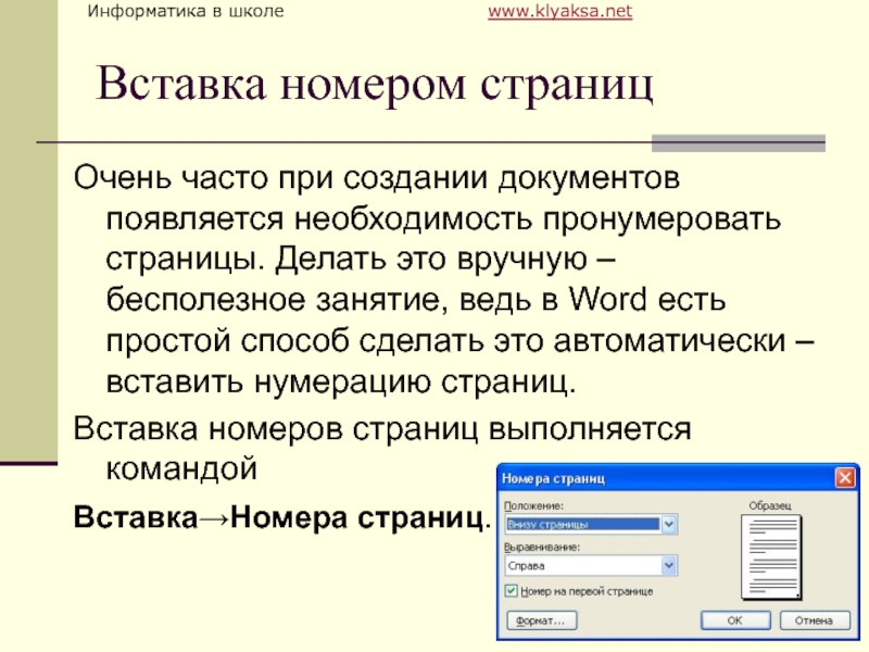 Вставка номером страницОчень часто при создании документов появляется необходимость пронумеровать страницы. Делать это вручную – бесполезное занятие,