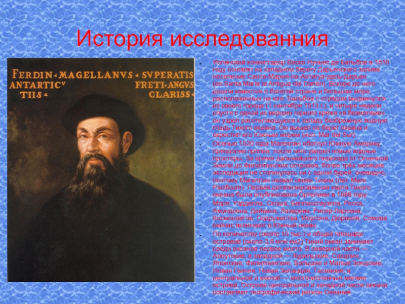 Осенью 1520 года Магеллан обогнул Южную Америку, преодолев пролив, после чего увидел новые водные просторы. За время дальнейшего перехода от Огненной Земли до Филиппинских островов, более трёх месяцев экспедиция не столкнулась ни с одной бурей, очевидно, поэтому Магеллан назвал океан Тихим (лат. Mare Pacificum). Первая детализированная карта Тихого океана была опубликована Ортелием в 1589 году.