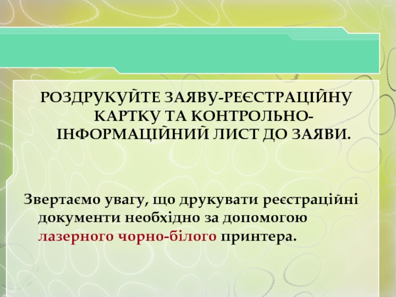 Слайд 36РОЗДРУКУЙТЕ ЗАЯВУ-РЕЄСТРАЦІЙНУ КАРТКУ ТА КОНТРОЛЬНО-ІНФОРМАЦІЙНИЙ ЛИСТ ДО ЗАЯВИ.