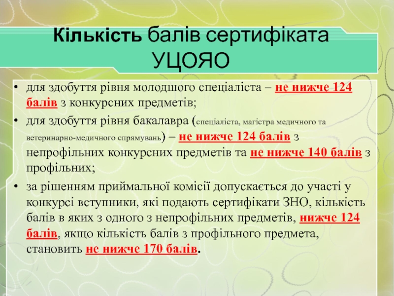 (спеціаліста, магістра медичного та ветеринарно-медичного спрямувань) – не нижче 124 балів з непрофільних конкурсних предметів та не нижче 140 балів з профільних;