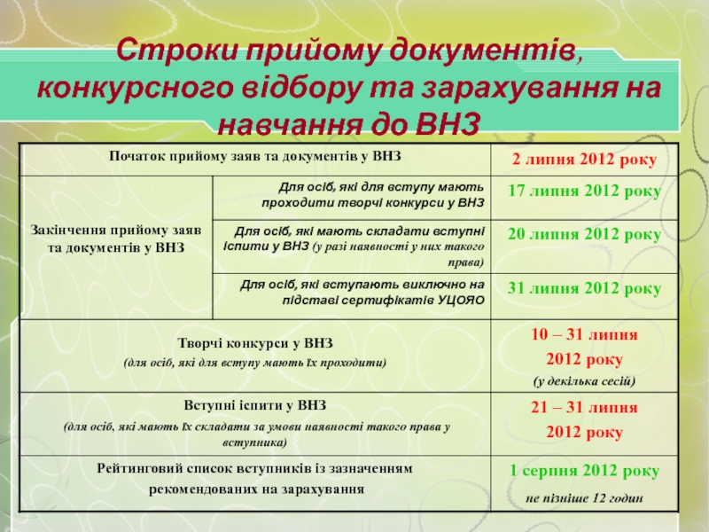 Слайд 18Строки прийому документів, конкурсного відбору та зарахування на навчання до