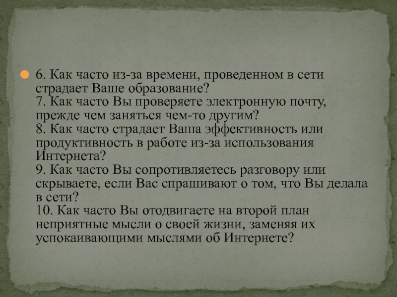 10. Как часто Вы отодвигаете на второй план неприятные мысли о своей жизни, заменяя их успокаивающими мыслями об Интернете?