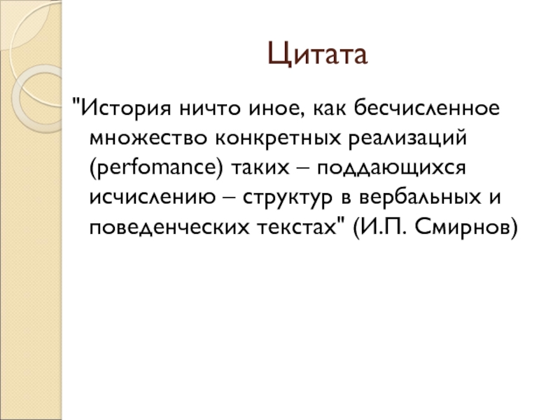 "История ничто иное, как бесчисленное множество конкретных реализаций (perfomance) таких
