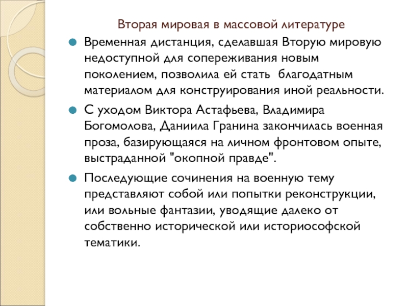 С уходом Виктора Астафьева, Владимира Богомолова, Даниила Гранина закончилась военная проза, базирующаяся на личном фронтовом опыте, выстраданной "окопной правде".