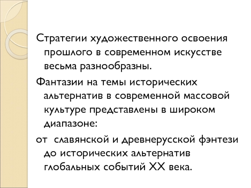 Стратегии художественного освоения прошлого в современном искусстве весьма разнообразны. Фантазии на темы исторических альтернатив в современной массовой культуре представлены в широком диапазоне: от славянской и древнерусской фэнтези до исторических альтернатив глобальных