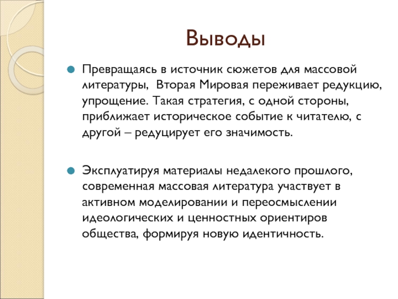 ВыводыПревращаясь в источник сюжетов для массовой литературы, Вторая Мировая переживает редукцию, упрощение. Такая стратегия, с одной стороны,