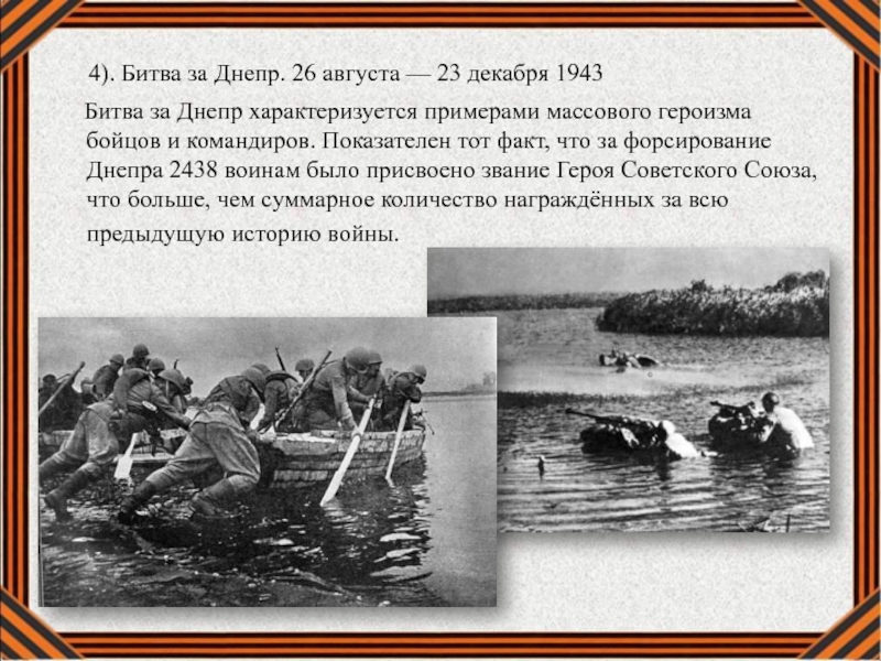 командиров. Показателен тот факт, что за форсирование Днепра 2438 воинам было присвоено звание Героя Советского Союза, что больше, чем суммарное количество награждённых за всю предыдущую историю войны.