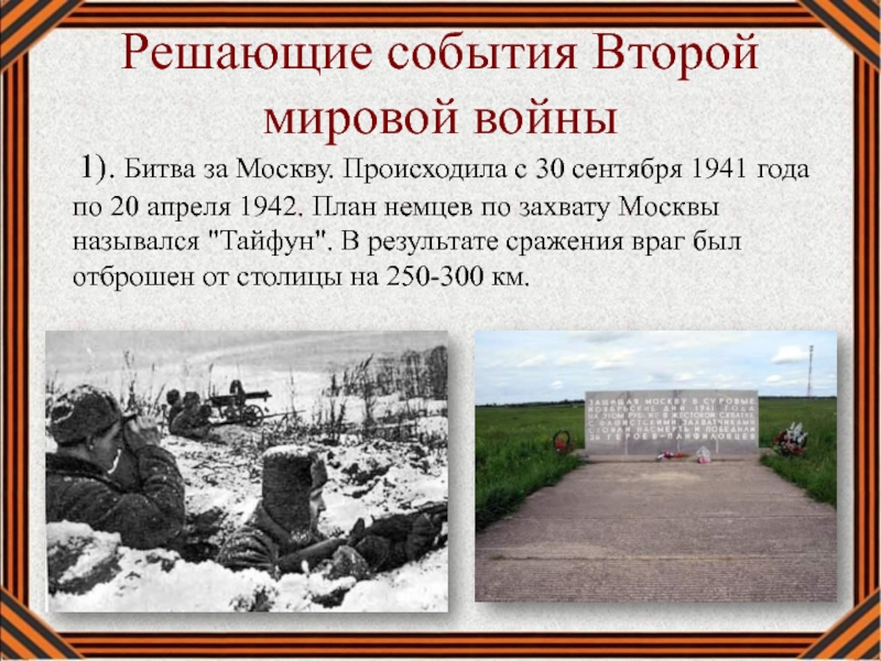План немцев по захвату Москвы назывался "Тайфун". В результате сражения враг был отброшен от столицы на 250-300 км.