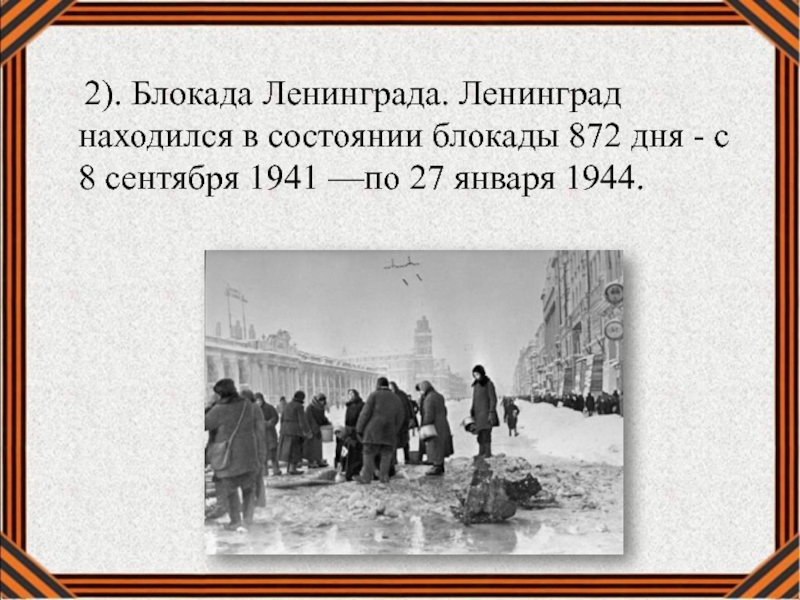 Слайд 11 2). Блокада Ленинграда. Ленинград находился в состоянии блокады