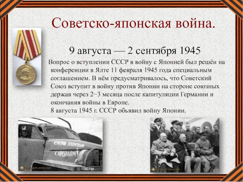 февраля 1945 года специальным соглашением. В нём предусматривалось, что Советский Союз вступит в войну против Японии на стороне союзных держав через 2−3 месяца после капитуляции Германии и окончания войны в Европе.