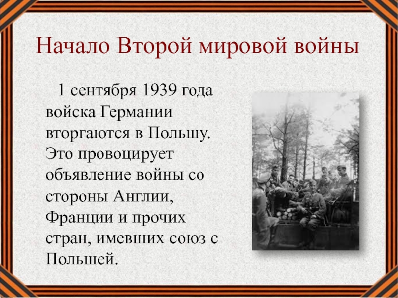войска Германии вторгаются в Польшу. Это провоцирует объявление войны со