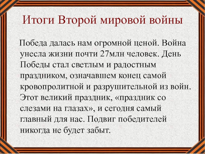и радостным праздником, означавшем конец самой кровопролитной и разрушительной из войн. Этот великий праздник, «праздник со слезами на глазах», и сегодня самый главный для нас. Подвиг победителей никогда не будет забыт.