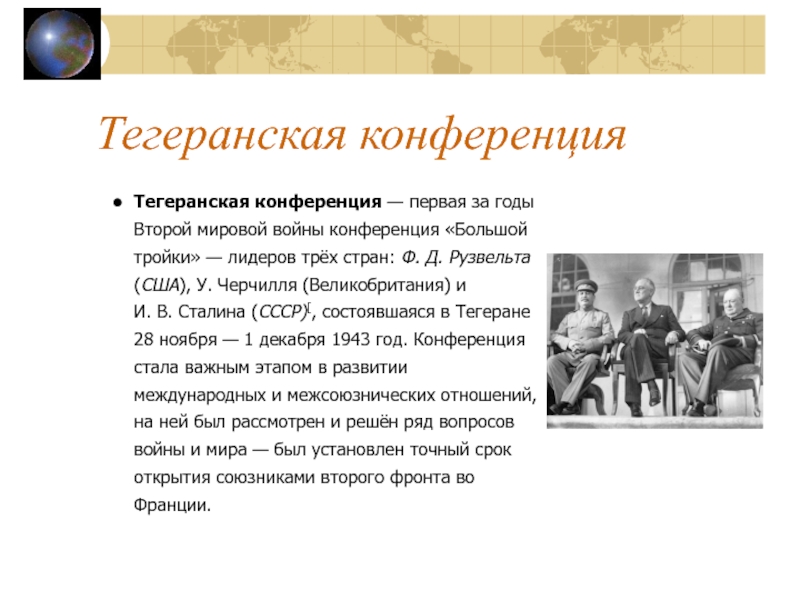 и И. В. Сталина (СССР)[, состоявшаяся в Тегеране 28 ноября — 1 декабря 1943 год. Конференция стала важным этапом в развитии международных и межсоюзнических отношений, на ней был рассмотрен и решён ряд вопросов войны и мира — был установлен точный срок открытия союзниками второго фронта во Франции.