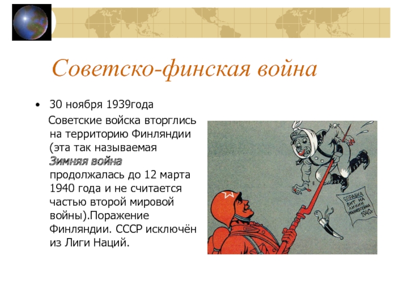 1940 года и не считается частью второй мировой войны).Поражение Финляндии. СССР исключён из Лиги Наций.