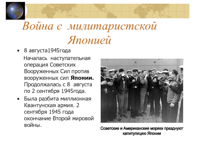 Была разбита миллионная Квантунская армия. 2 сентября 1945 года окончание Второй мировой войны.