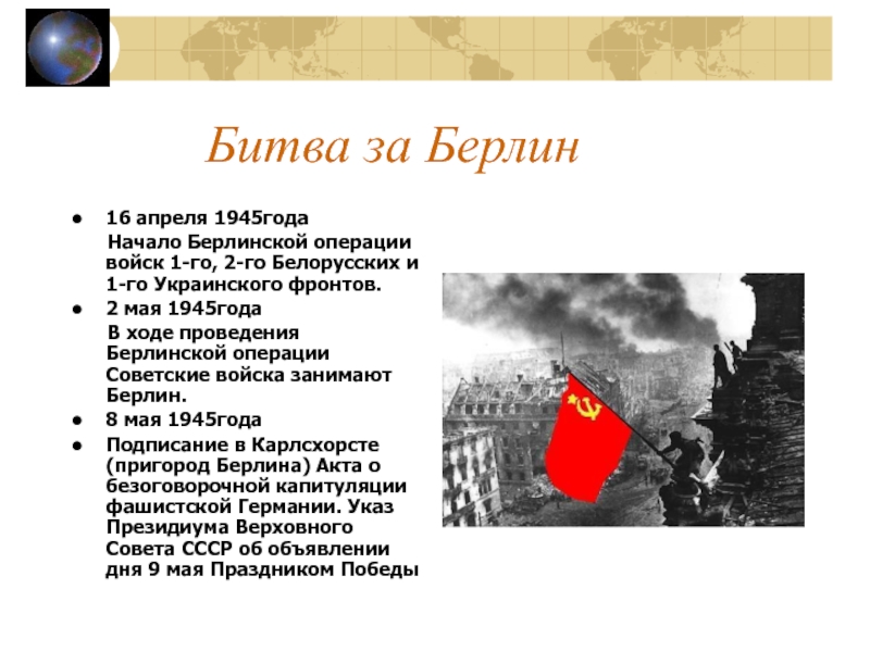 Подписание в Карлсхорсте (пригород Берлина) Акта о безоговорочной капитуляции фашистской Германии. Указ Президиума Верховного Совета СССР об объявлении дня 9 мая Праздником Победы